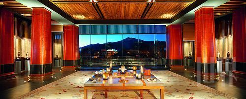 大堂才是Jean Michel Gathy最完美的杰作。一幕巨大的落地玻璃窗將拉薩的城景定格,拉薩城、喜瑪拉雅山及周邊的壯麗景色在眼前鋪展開來,而焦點自然是遠處的布達拉宮。在酒店內,150間套房、12棟別墅和一間總統(tǒng)套房,幾乎所有房間,都能輕易看見布達拉宮,最美妙的自然是總統(tǒng)套房,那巨大的圓形浴缸,洗浴間的窗口正對著那美得讓你目不轉睛的宮殿。