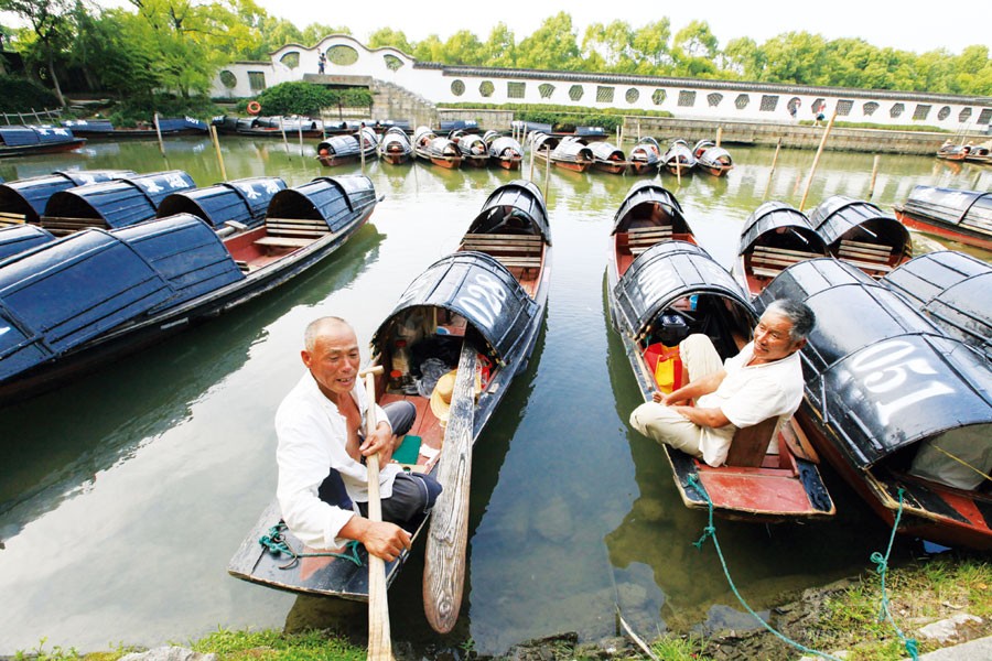 ????今年上半年,景區(qū)又與紹興市非物質(zhì)文化遺產(chǎn)保護中心聯(lián)合成立了“烏篷船制作展示基地”及“腳劃船俗培訓基地”,共同開展烏篷船制作技藝和腳劃船俗兩個非物質(zhì)文化遺產(chǎn)項目的研究、保護工作,給烏篷船制作技藝傳承人提供了一個學習、交流及展示的平臺。高阿二師傅是一位很有口碑的老船工,在上半年的考核中被評為四星級船工,在景區(qū)搞烏篷船旅游項目之前,他以打魚為生,水性很好。