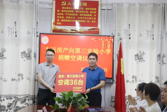 “方遠房地產(chǎn)公司為第三實驗小學捐贈空調(diào),大大改善學校的降溫條件,為孩子們營造更為舒適的學習環(huán)境?!钡谌龑嶒炐W校長王玉剛表示,學校將以此為契機,號召廣大學生好好學習,長大后回報社會;全校教職員工以優(yōu)異的教學業(yè)績回報社會,傳遞愛心,努力辦學生快樂、教師幸福、家長滿意的現(xiàn)代化學校。