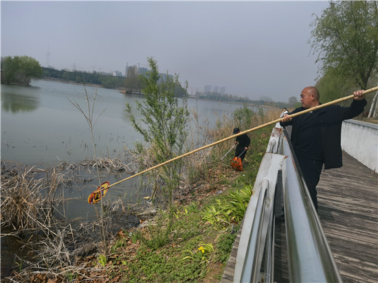 4月16日,周口植物園管理人員及保潔人員在打撈漂浮在湖水中的垃圾及枯草。為了給市民提供一個干凈、優(yōu)美的園內環(huán)境,植物園的工作人員每天都會清理打撈湖水中的雜物。