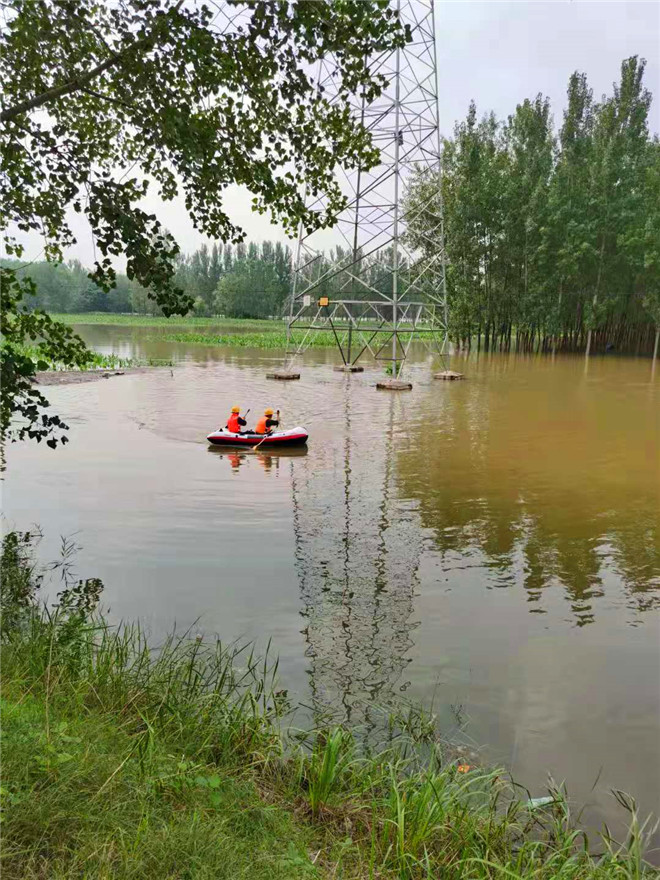 為了確保周口主網(wǎng)高壓線路安全穩(wěn)定運行,連日來,“小毛”毛學(xué)用和他的同事克服困難劃著皮劃艇,人工近距離檢查桿塔基礎(chǔ)泡水情況。