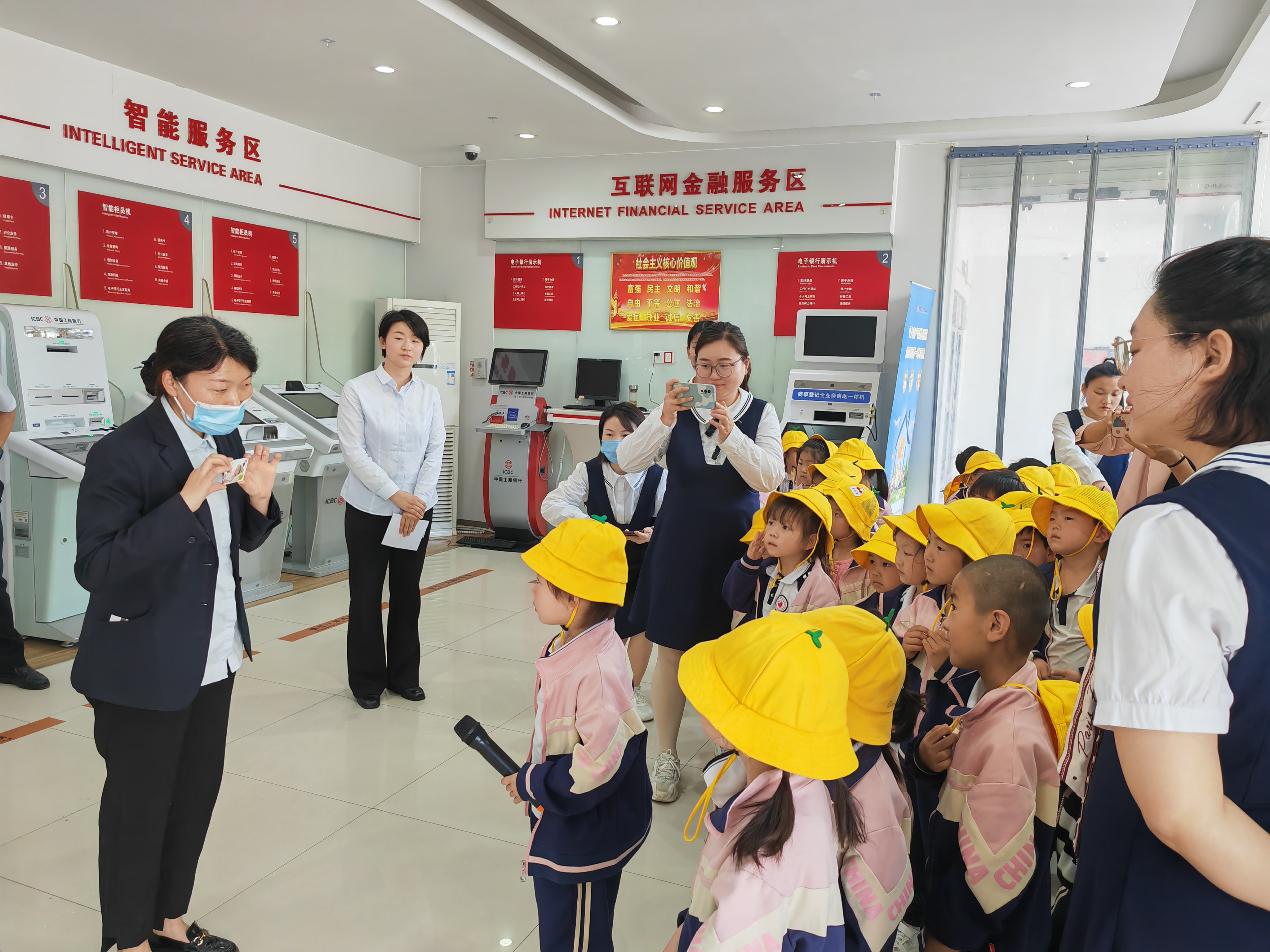 小朋友們?cè)趨⒂^營業(yè)網(wǎng)點(diǎn)中,該行工作人員為孩子們講解取號(hào)機(jī)、業(yè)務(wù)咨詢臺(tái)、服務(wù)窗口、自動(dòng)存取款機(jī)功能,簡要介紹辦理銀行業(yè)務(wù)流程,并對(duì)孩子們提出的問題一一解答。