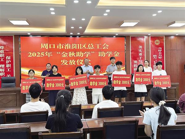 8月20日上午,淮陽區(qū)總工會舉行2025年“金秋助學”助學金發(fā)放儀式,為18名考上大學的困難職工子女每人發(fā)放“金秋助學”助學金3000元。記者 侯俊豫 通訊員 張艷榮 攝
