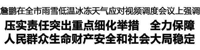 本報訊 (記者 李鳳霞) 1月18日,市長詹鵬主持召開全市雨雪低溫冰凍天氣應(yīng)對視頻調(diào)度會議,強調(diào)要深入學(xué)習(xí)貫徹習(xí)近平總書記關(guān)于防災(zāi)減災(zāi)救災(zāi)的重要指示精神,貫徹落實省委和市委決策部署,以“時時放心不下”的責(zé)任感,扎實有效應(yīng)對雨雪低溫冰凍天氣,確保人民群眾生命財產(chǎn)安全和社會大局和諧穩(wěn)定??钻枴⒅煜蜿?、張建黨、程若光、王文峰出席會議。