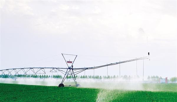 近日,在河南周口國家農(nóng)高區(qū)鄲城縣高標準農(nóng)田示范區(qū),平移式噴灌機伸展銀色“臂膀”,將精準調(diào)配的水肥溶液均勻灑向綠油油的麥田。